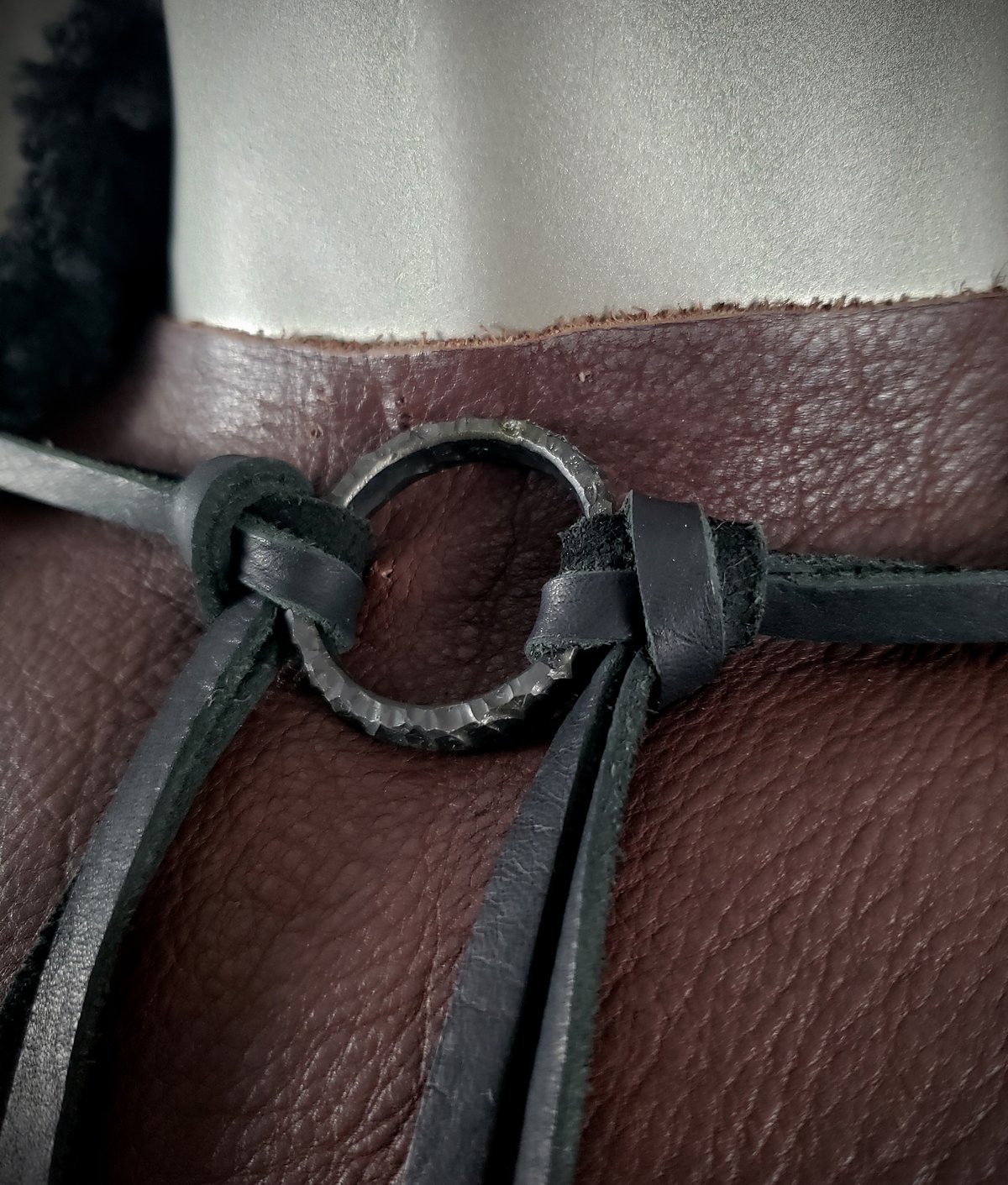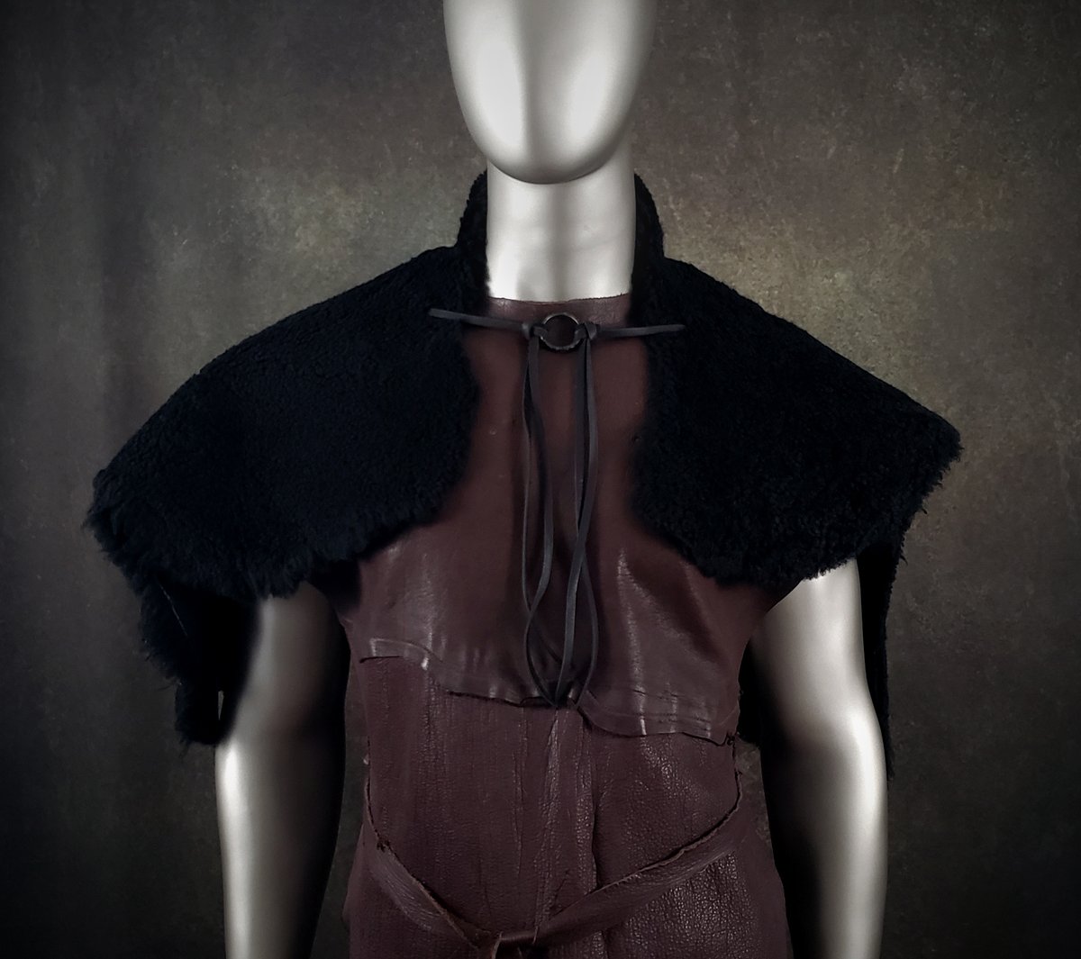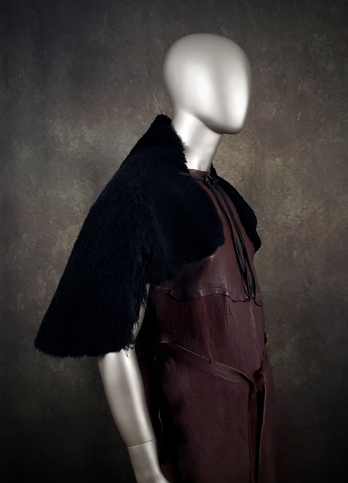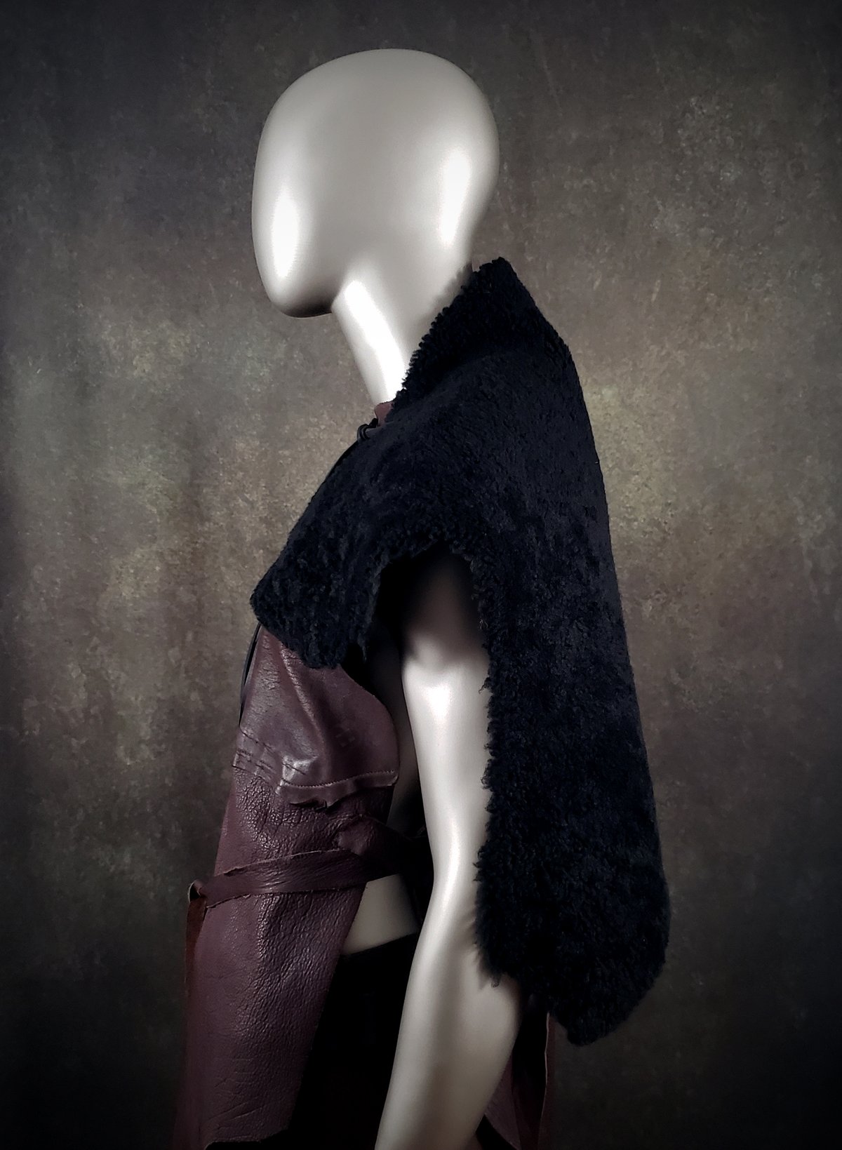 This genuine tanned fur garment is made from a sheared Sheepskin that has been dyed black. It is fastened with leather ties and a hand-forged metal ring. Ties are adjustable on both sides. The mantle is unlined and lightweight. It would make a perfect accent to any garb.