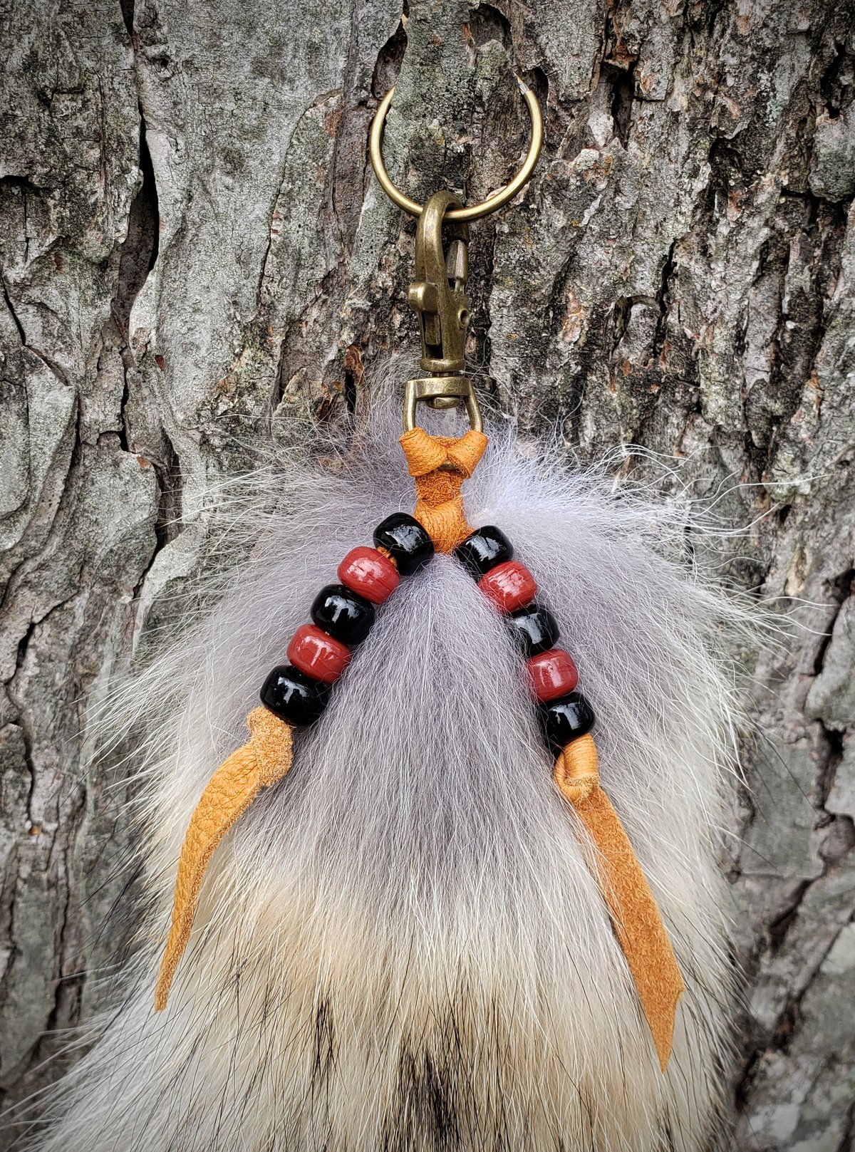This genuine tanned Coyote tail has an antique style swivel clasp, which makes clipping it on and off easy. It is accented with glass beads. They are secured with deerskin leather, NOT glued into a metal cap like many others (glue will often dry out the leather and break over time). A removable key-ring is included.