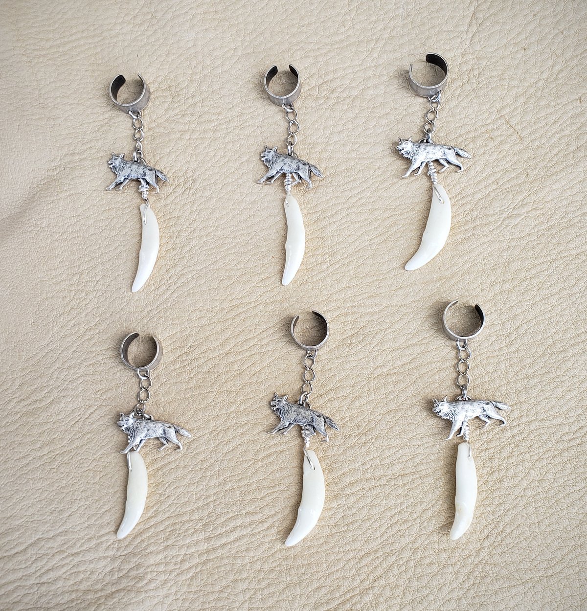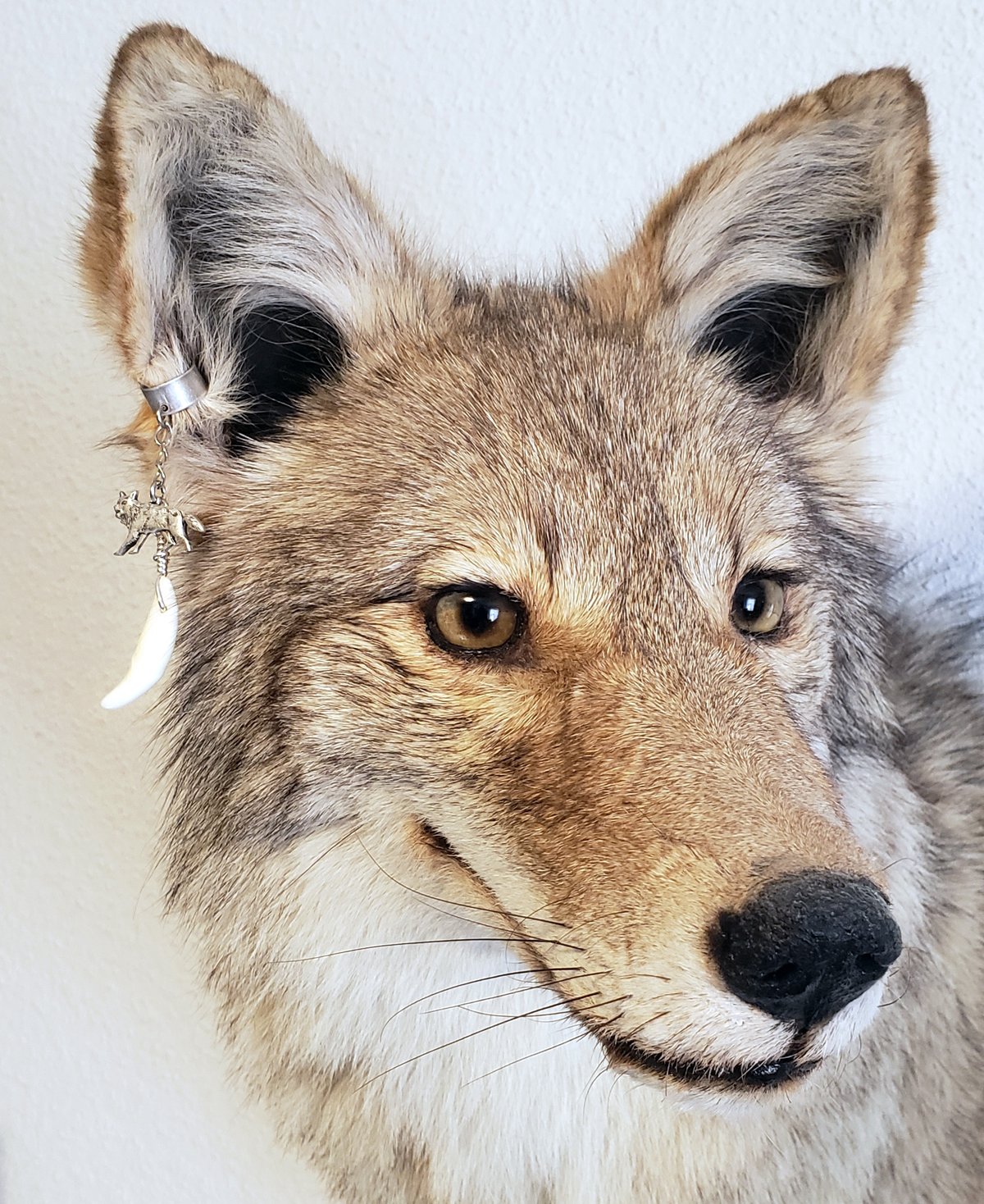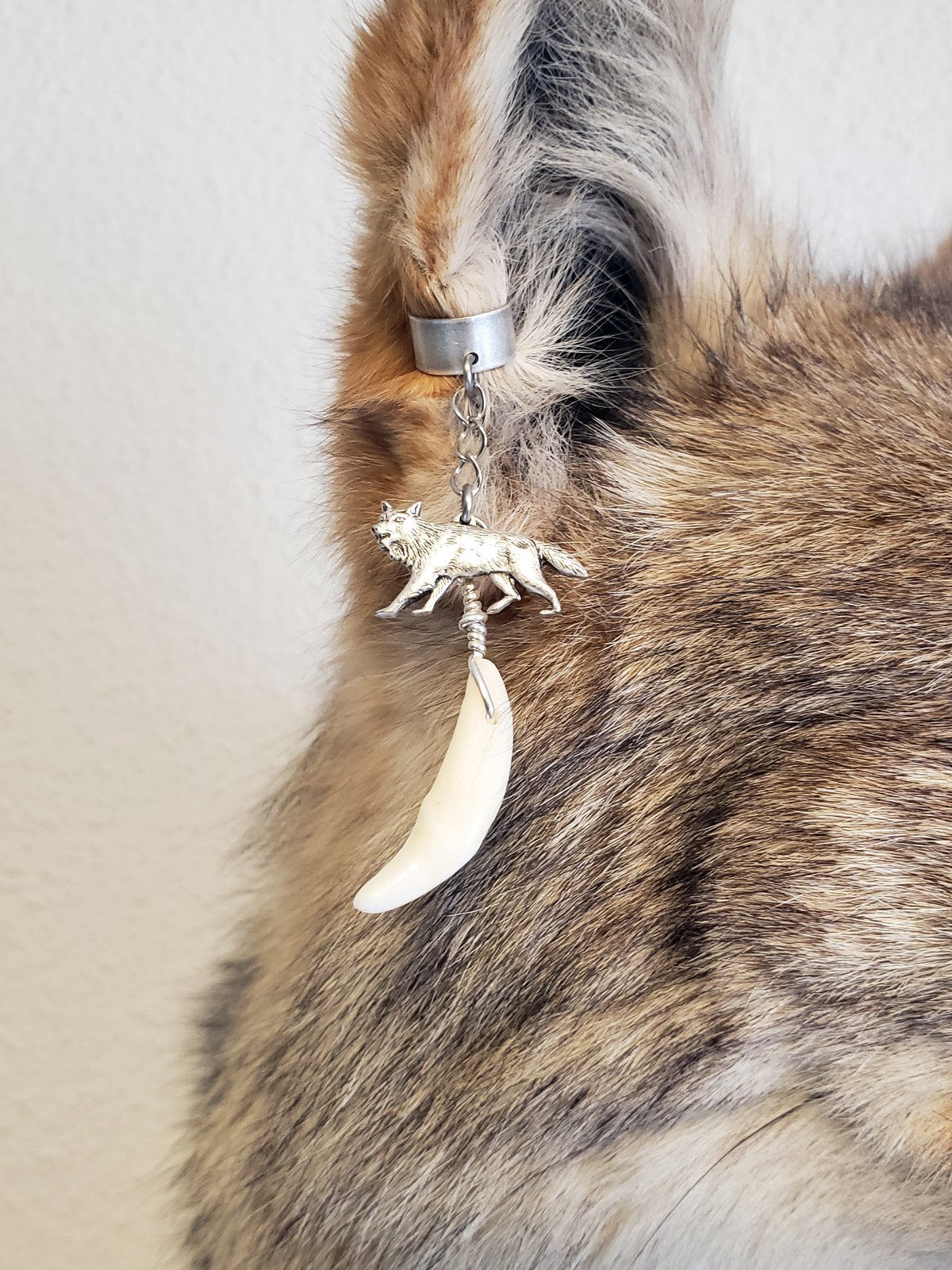 This silver-plated brass ear cuff is made with a real Coyote tooth (Canis latrans) and a silver-plated brass Coyote (or Wolf) charm. The cuffs are malleable enough to fit anyone.