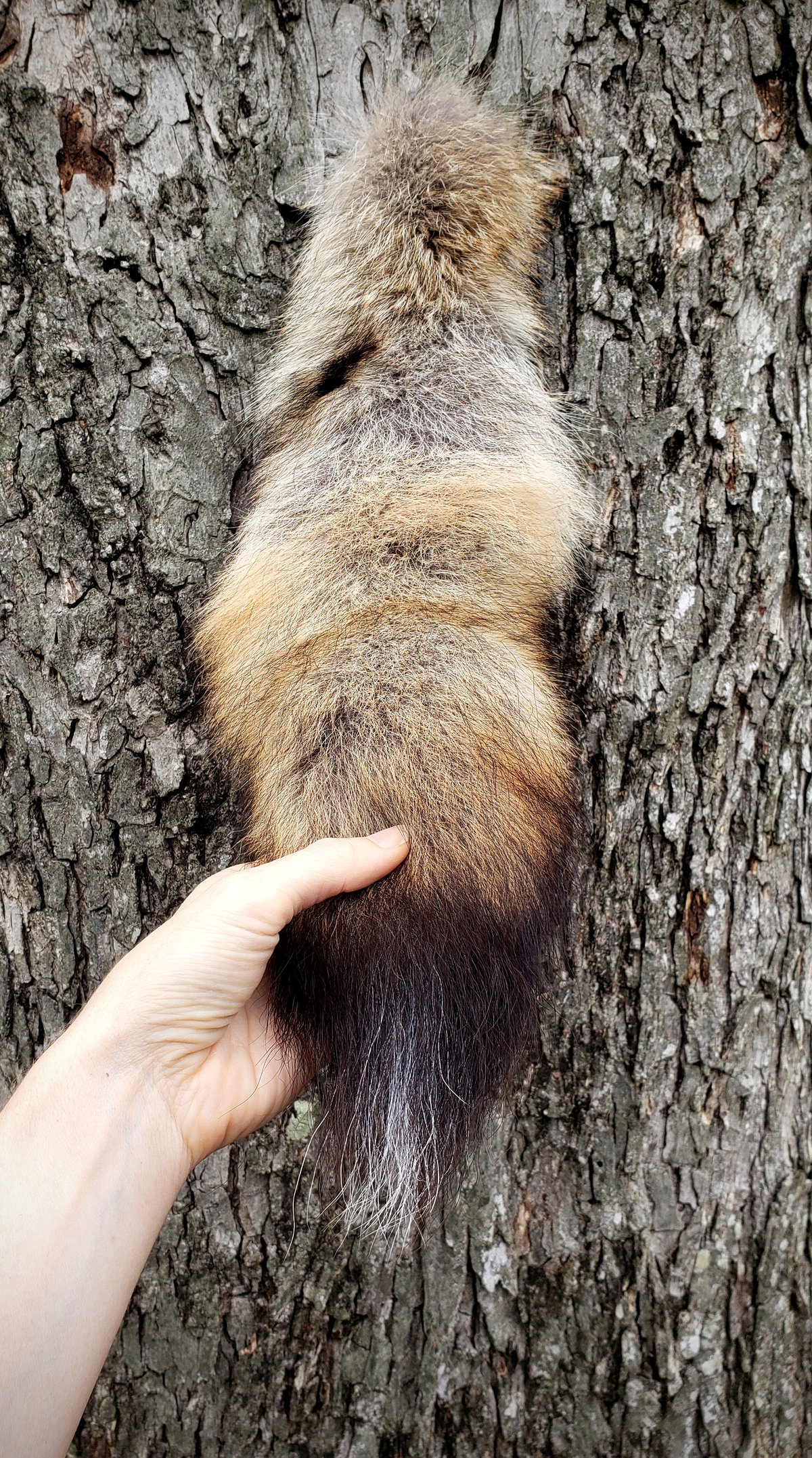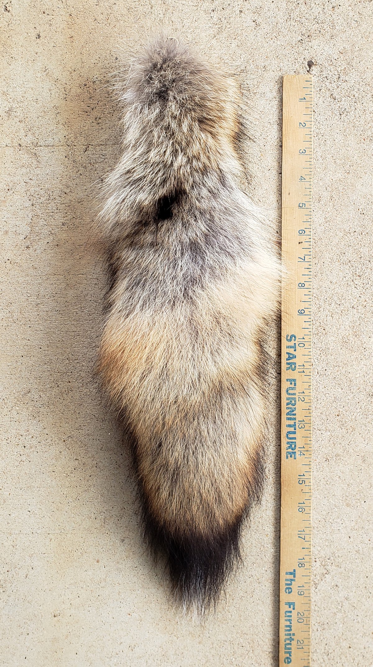 Tail measures 19.5 inches long from the base to the tip of the fur, not including the clasp. Overall color is medium brown, and a black tip with white in the center (which makes this one even more special!) Longest fur is 4". This is a very full tail!