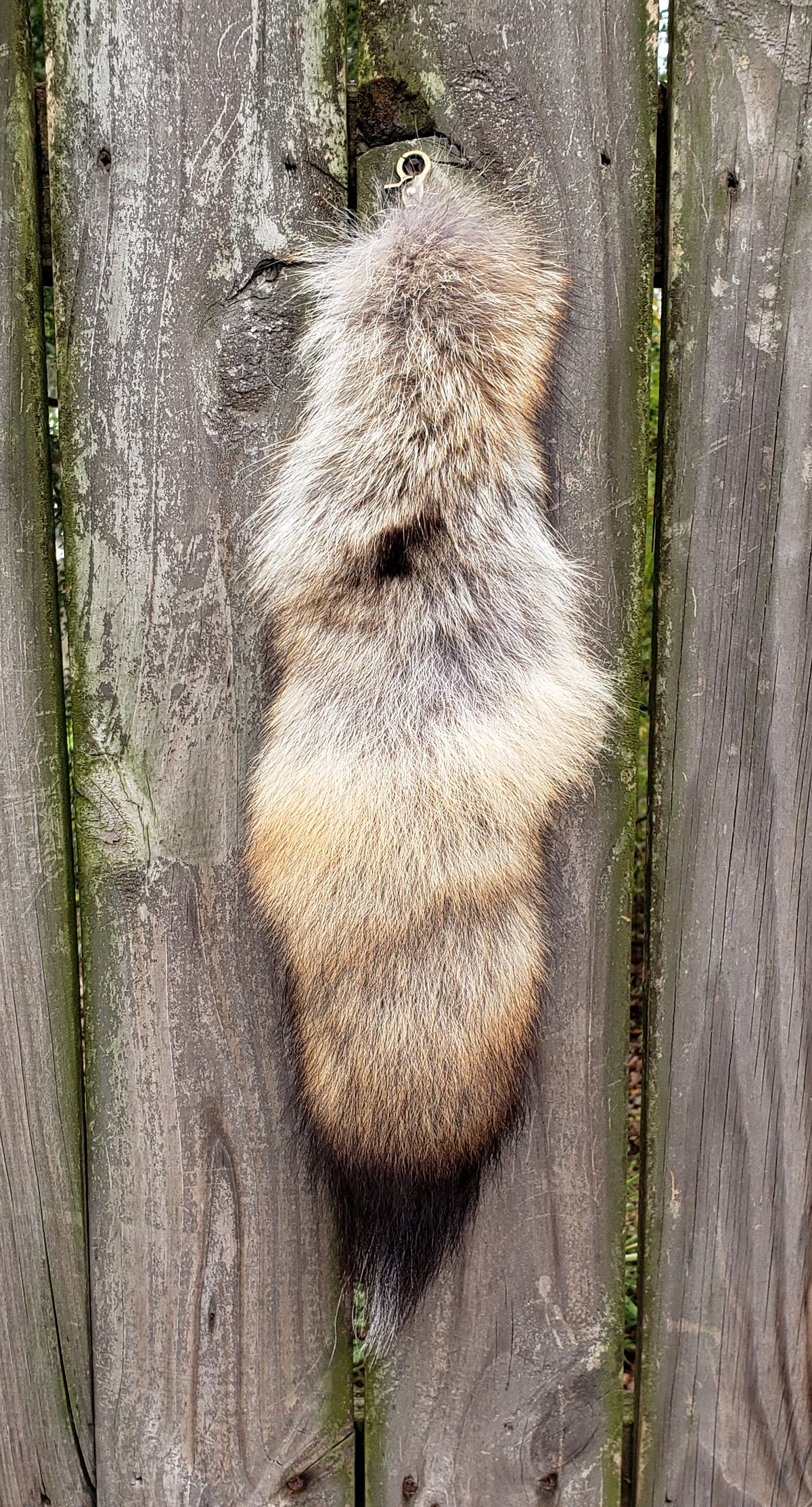 This wearable tanned Coywolf tail (hybrid wolf and coyote) is suspended from an antique style lobster clasp to make clipping it on and off easy.