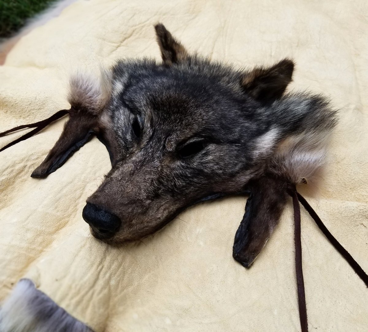 Wolf headdress is made from an unusual dark brown Canadian Grey Wolf (Canis lupus) head, which was tanned and carefully shaped into a natural looking state. This face was a discard by a garment maker and has some repairs.