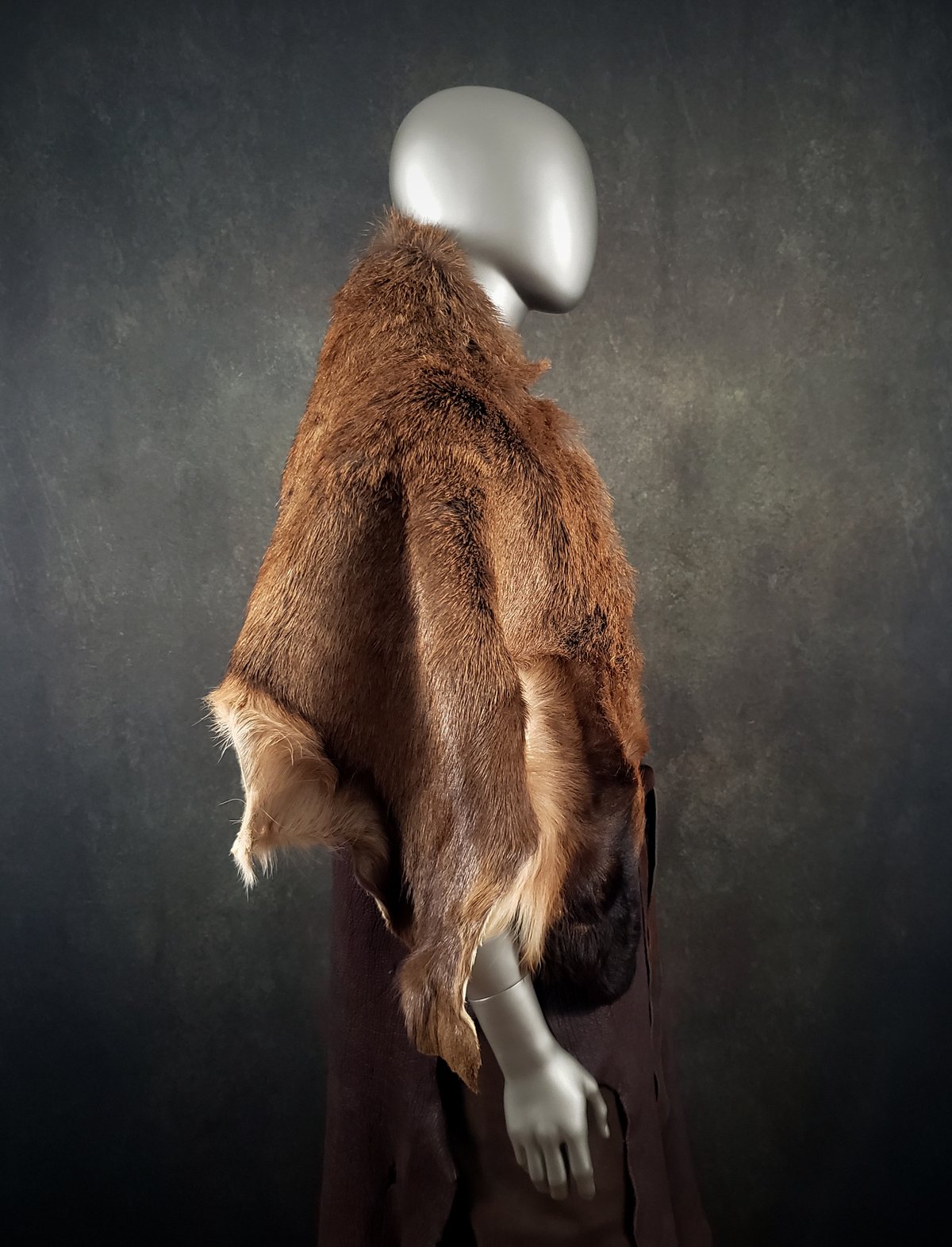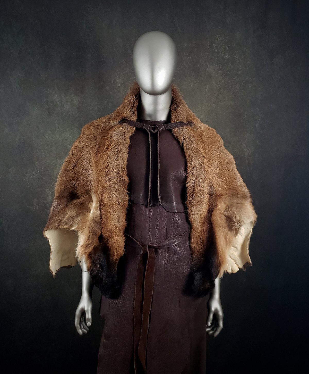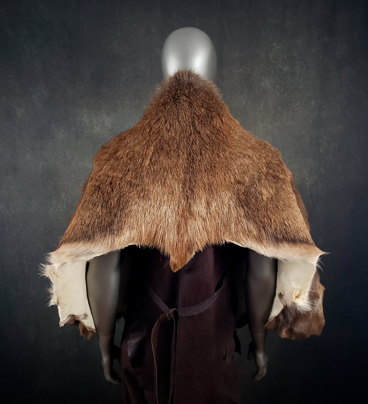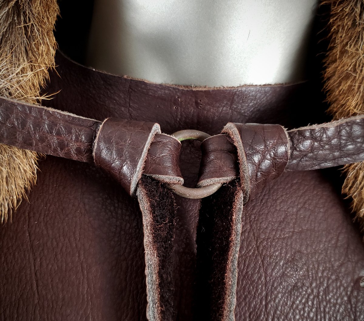 This cape is made from a tanned Red Deer (Cervus elaphus) hide. It is fastened with Bison leather ties and an ancient metal ring (a European artifact found via metal detector). Ties are adjustable on both sides.