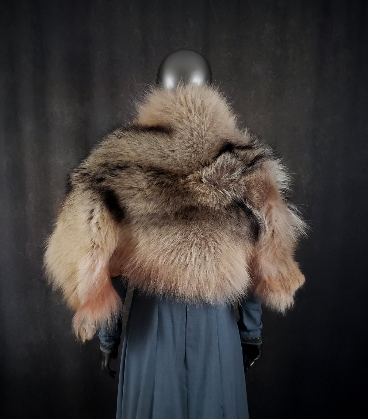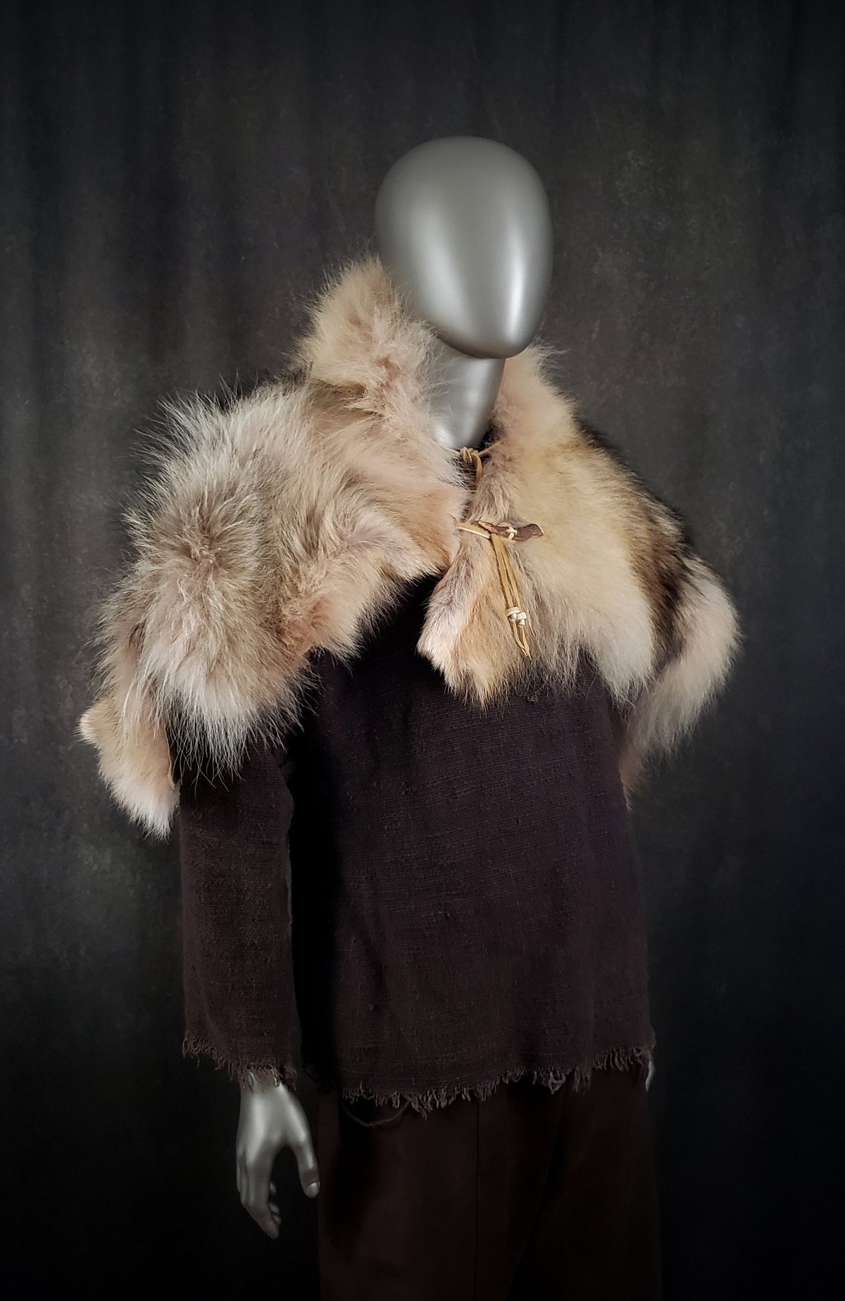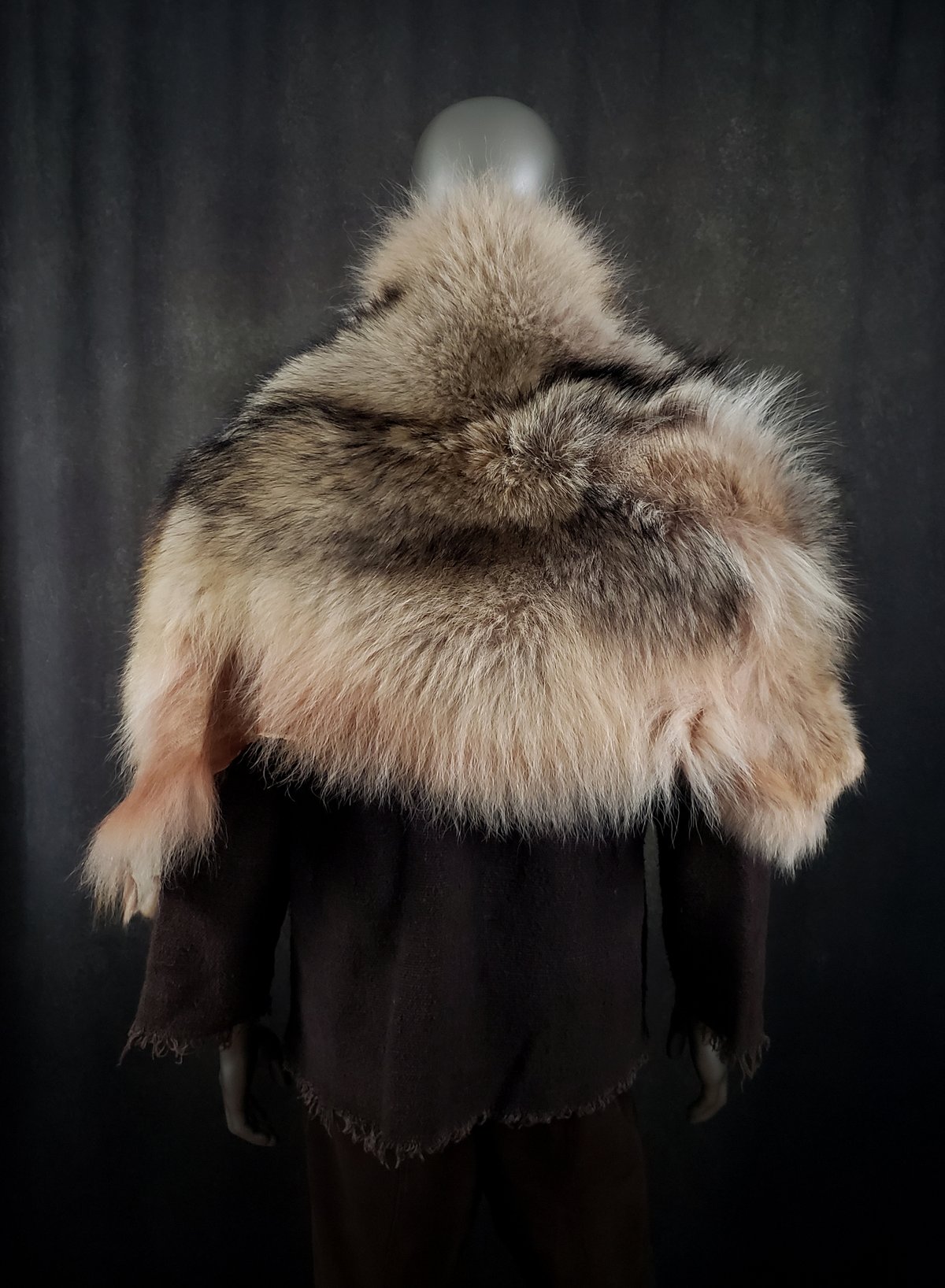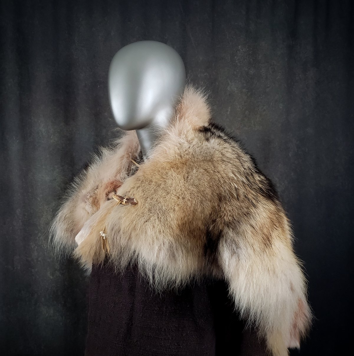 This genuine tanned fur cloak is made with the skin of a Grey Wolf (Canis lupus) and is fastened with Moose leather ties, an antler tip, and an ancient metal ring (a European artifact found via metal detector). It is unlined, and medium-weight, making it easy to add to any style garb. Fur color is a rich cream and brown with black guard hair.