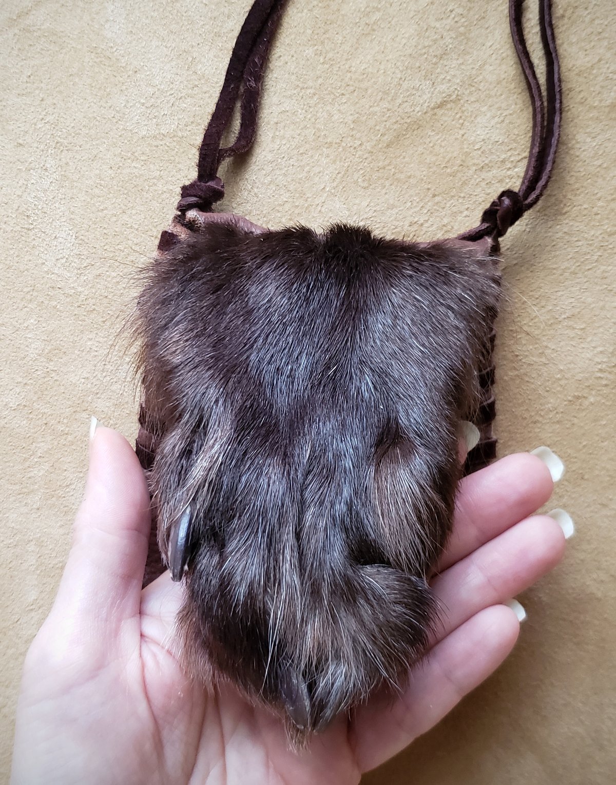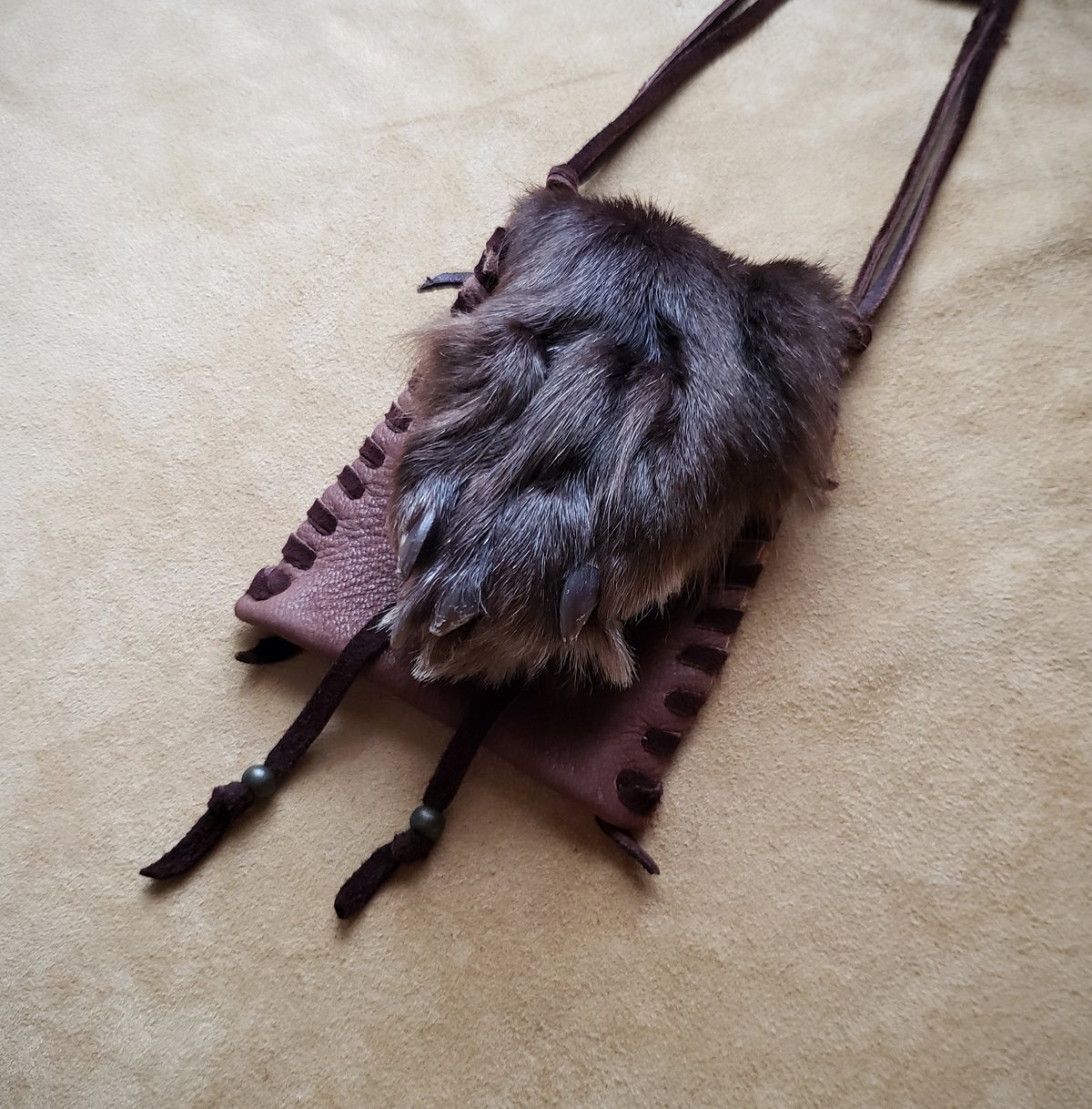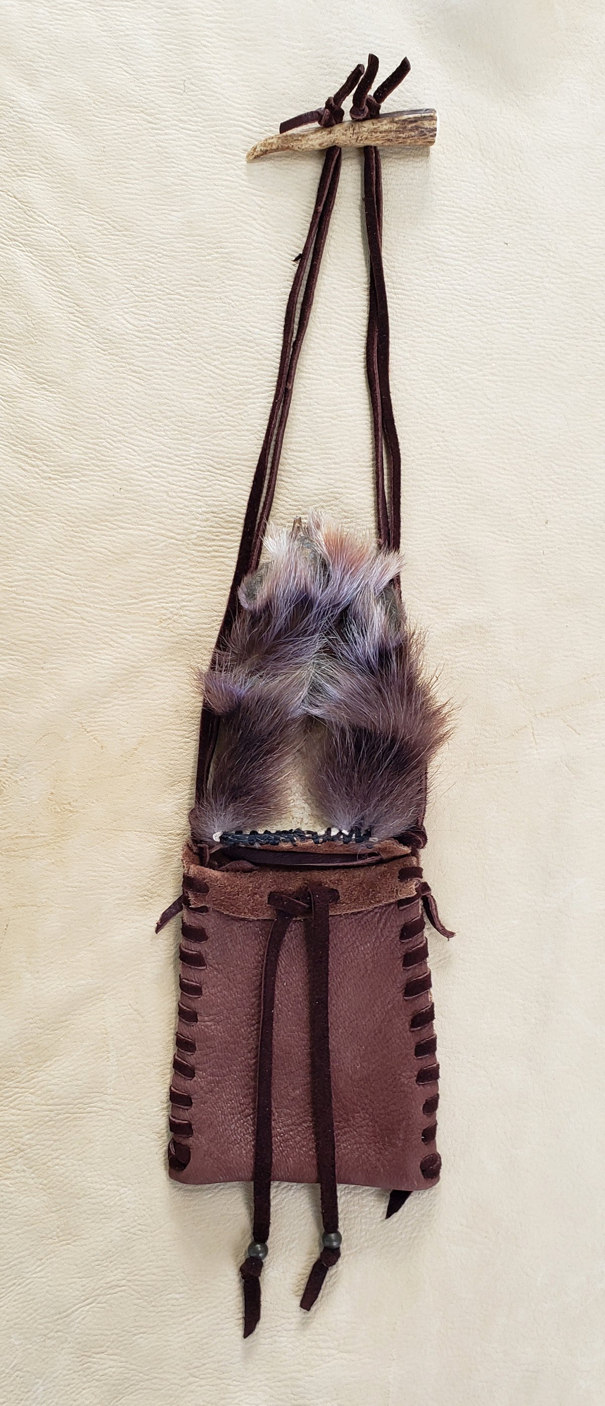 This soft brown Moose leather bag is hand-sewn with Deerskin lace and features a Wolf (Canis lupus) paw flap (rear foot with pads and all 4 claws). Hangs from a 12" Moose leather and Deer antler strap. Accented with brass beads.