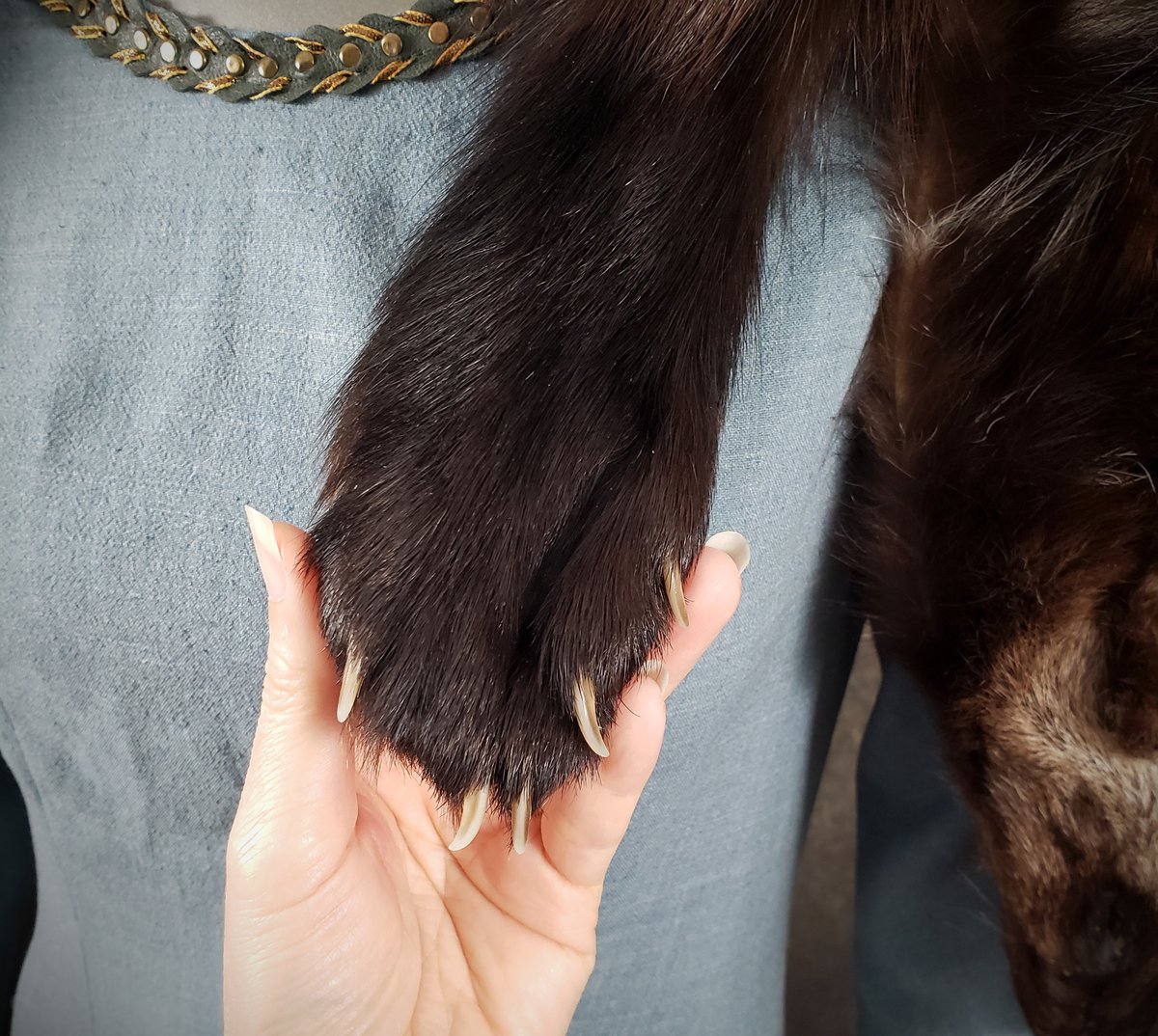 This stunning tanned fur mantle is made with the full skin of a Wolverine (Gulo gulo), including head, tail, paws and all the claws. The cape closes with a chain and toggle clasp. The skin is unlined, soft, and light-weight, making it easy to add to any style garb.